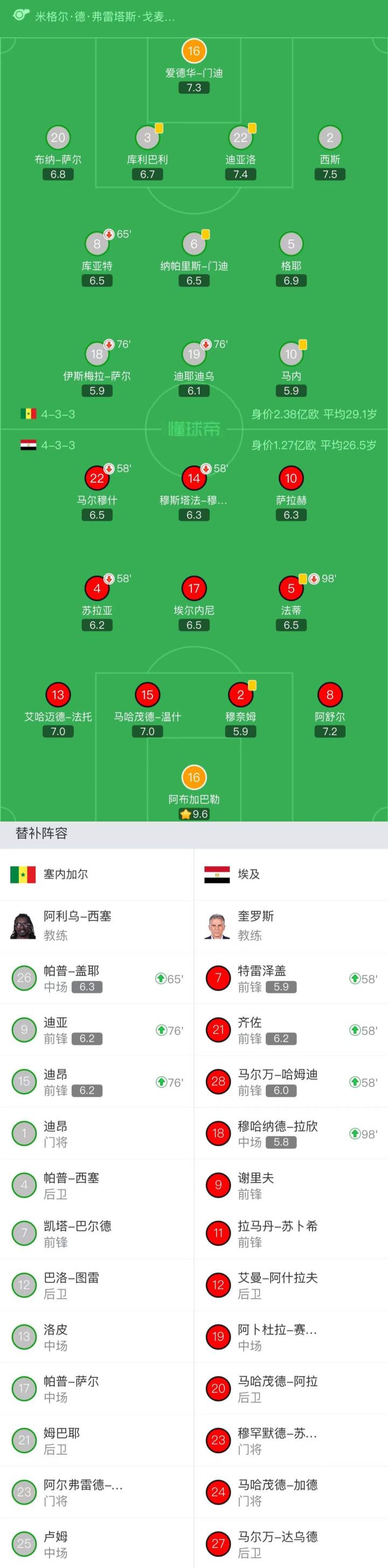 塞内加尔首发:16-爱德华-门迪、2-西斯、22-迪亚洛、3-库利巴利、6-纳帕里斯-门迪、20-布纳-萨尔、18-伊斯梅拉-萨尔(76'9-迪亚)、8-库亚特(65'26-帕普-盖耶)、19-迪耶迪乌(76'15-迪昂)、5-格耶、10-马内