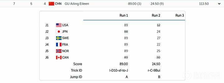 而在第二跳中,谷爱凌在落地时雪板脱落,这次严重失误导致她这一跳仅得到24.50分。