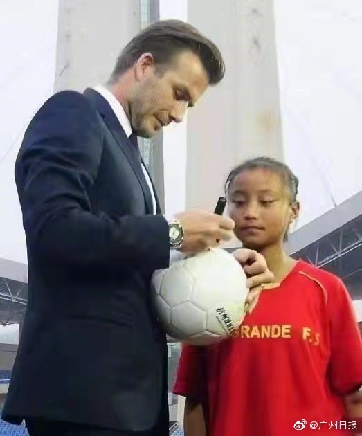 (图)少年张琳艳得到贝克汉姆亲笔签名的足球