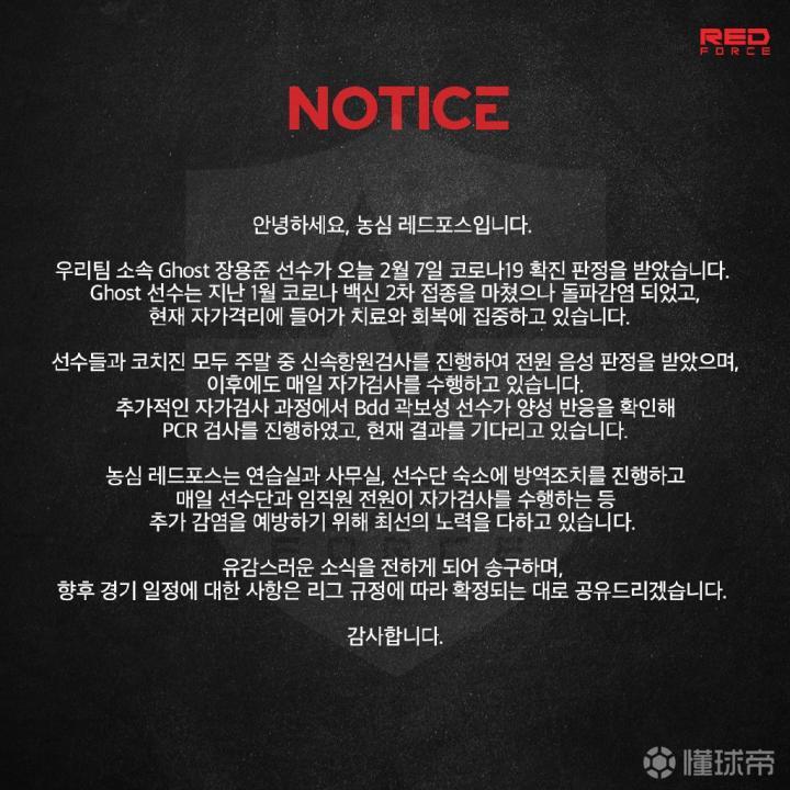 NS RedForce对练习室、办公室,选手宿舍均采取了防疫措施,选手及职员每天都进行了自我检测,竭力防止更多感染病例的出现。