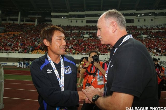 ↑2015年亚冠半决赛首回合,片野坂知宏(左)和时任广州恒大主帅斯科拉里握手。当时的大阪钢巴主帅长谷川健太因停赛被迫坐在观众席,片野坂知宏代为指挥。那年恒大两回合2-1淘汰大阪钢巴,并最终获得冠军。