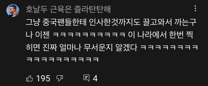 不管是因为有众多球迷或是庞大的市场,总而言之C罗非常重视中国球迷。对于相对受到冷落的韩国球迷来说,这是一件苦涩的事情。而C罗向中国球迷拜年的视频又一次打碎了韩国人脆弱的玻璃心,评论区可以说是酸成一片。