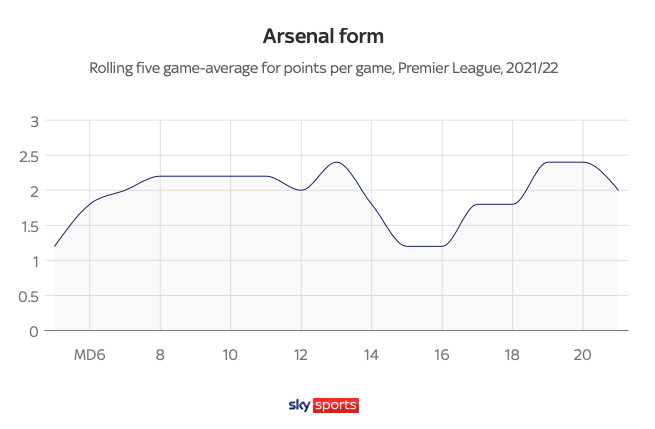 阿森纳每轮近5场比赛的场均取分趋势,横坐标代表轮数,纵坐标代表平均得分