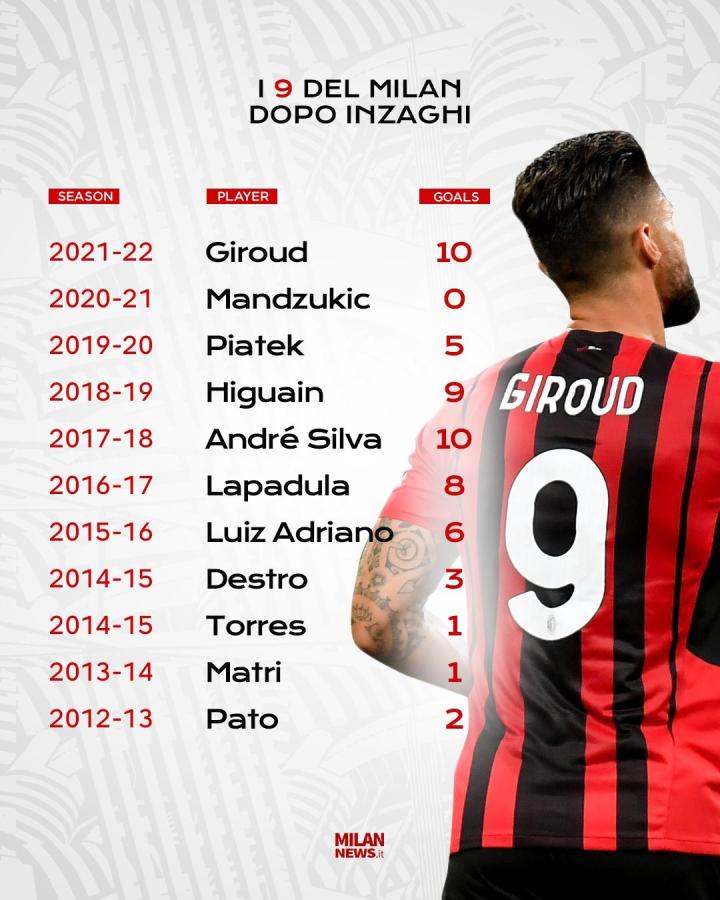2012年夏天米兰传奇名宿因扎吉退役之后,红黑军团每一年都由不同的球员身穿9号球衣,但大多未能满足球迷的期待。事实上,这十年里只有安德烈-席尔瓦和吉鲁的进球数达到了10个,而吉鲁目前效力米兰还尚未满一个赛季。