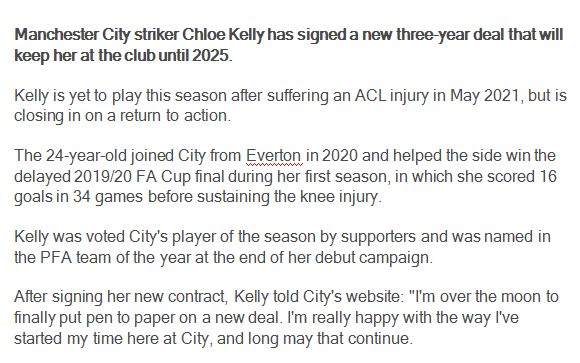 (英文原文及图片来自天空体育https://www.skysports.com/football/news/11095/12538401/manchester-city-women-chloe-kelly-signs-new-three-year-contract-to-commit-to-club-until-2025)
