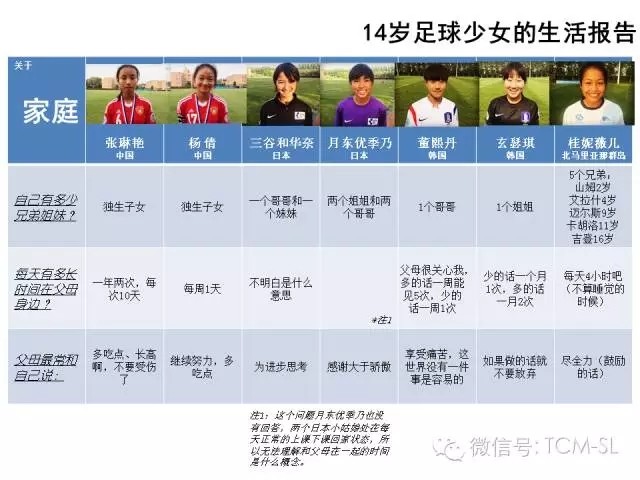 文中表示,只有中国的两个女孩儿是独生子女。联系到上一张图,日本的三谷和华奈,以及韩国的玄瑟琪都是受同辈哥哥的影响才开始踢球的,这在独生子女这一代是几乎不可能的事。