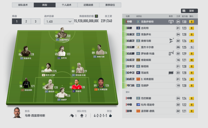 说明:上图是前华南区排位第一橙色范迪克的顶配荷兰队套与战术板,可以看到这套阵容多达8名远古巨星坐镇,边后卫再加上16工资的10卡维勒姆斯与广受好评的邓弗里斯,基本上没有弱点可言。而这套战术板在防守端也是非常稳健的,阵容收缩的速率较快,也有很不错的反击机会给到两名边锋。当然,像范巴斯滕、博格坎普以及西多夫等优秀进攻手在他阵容里也是有很多出场机会的。
