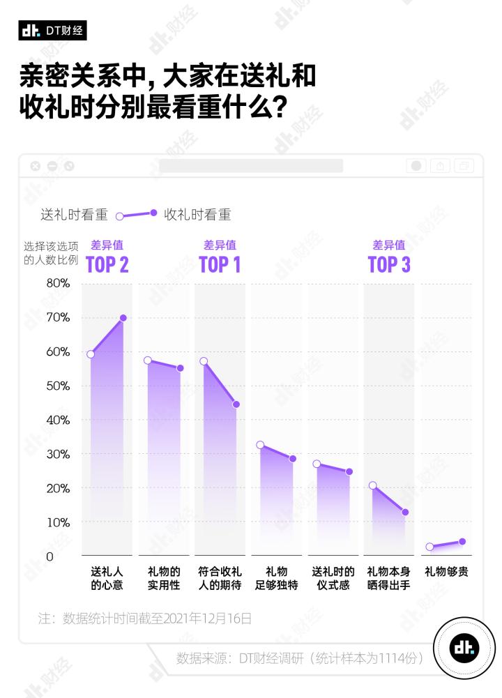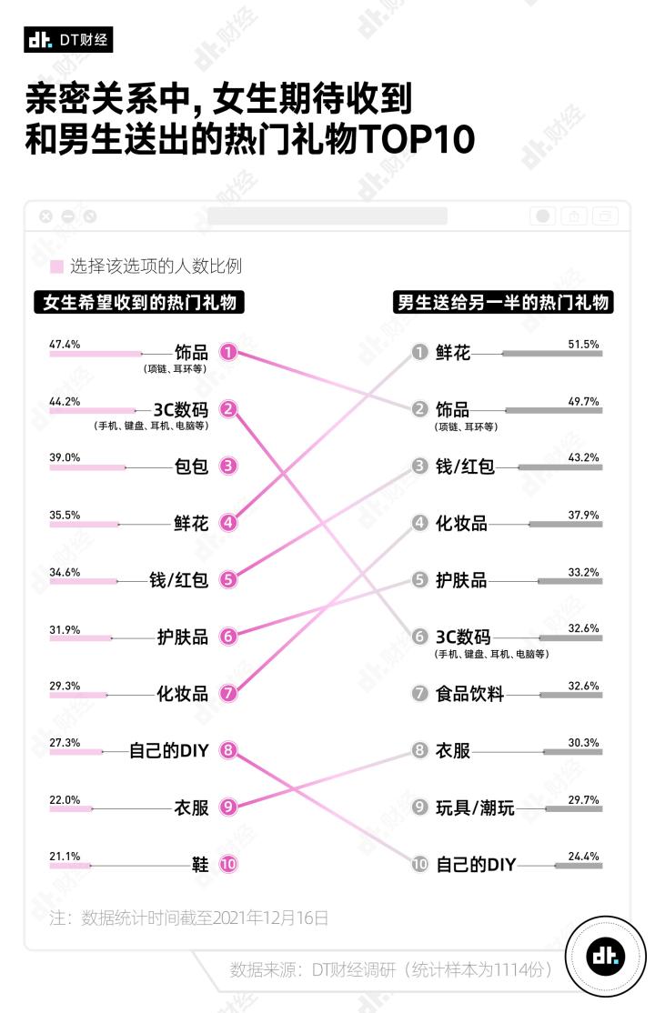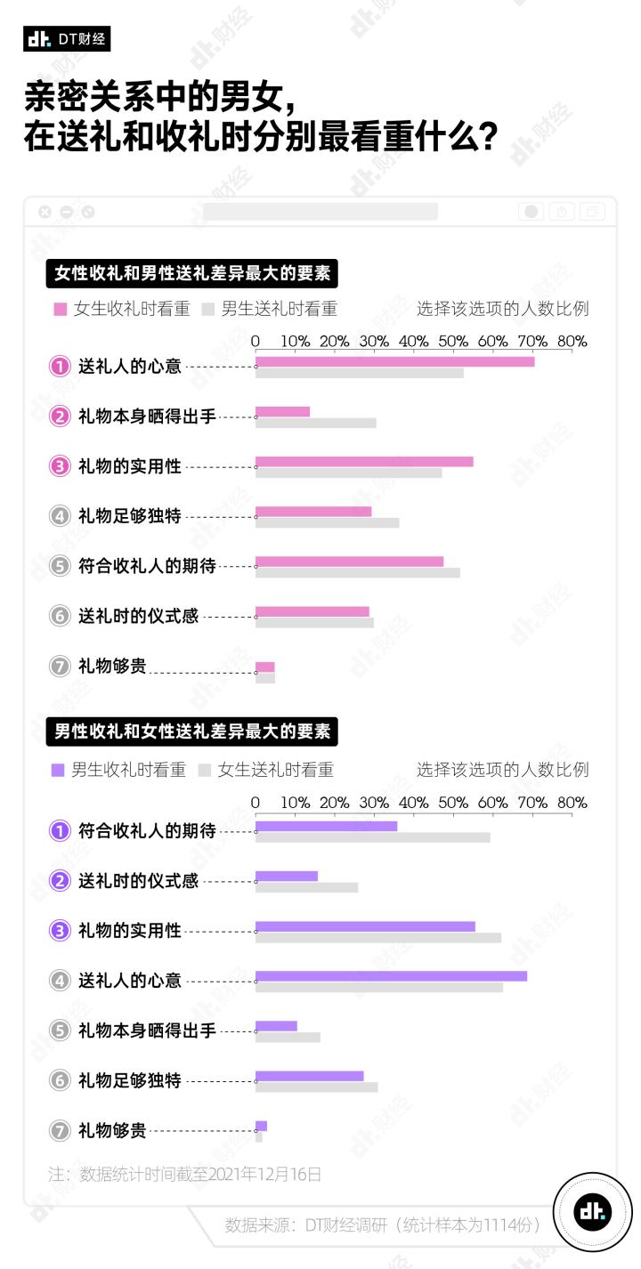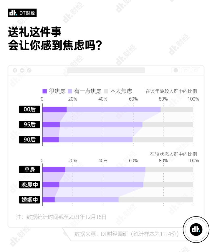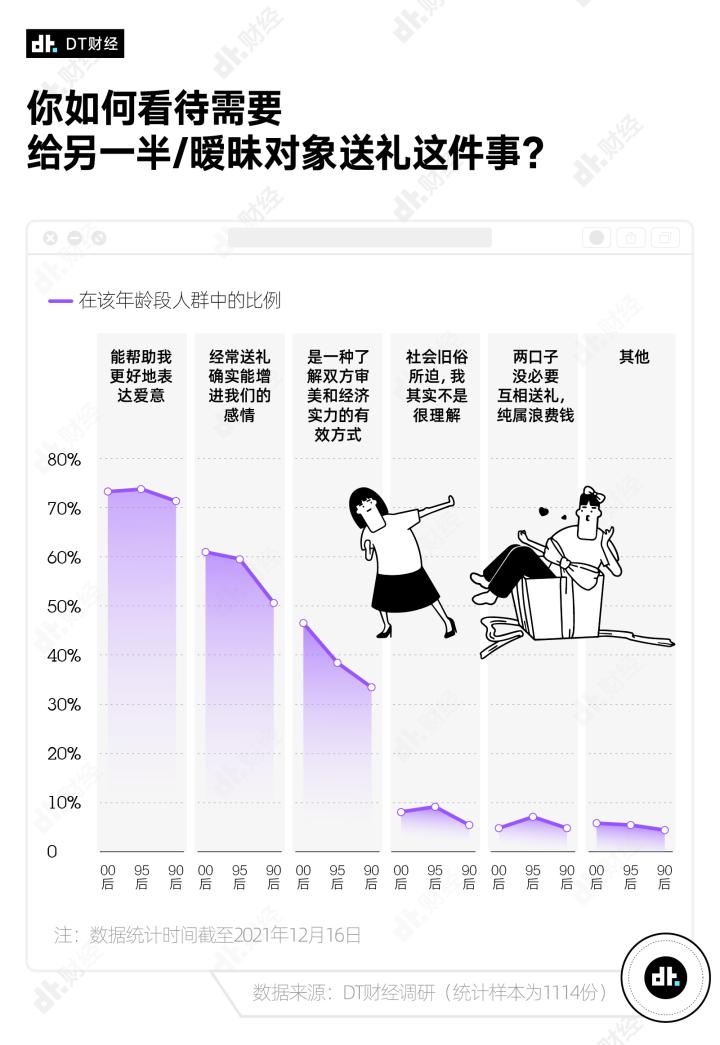 前些日子,DT财经发起了男男女女“送礼观”小调查,共有1114位朋友贡献了自己的答案,其中00后、95后和90后占比达9成。所以你也可以认为,这是针对18-32岁青年的送礼观察。