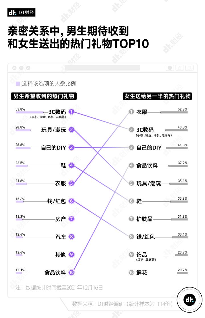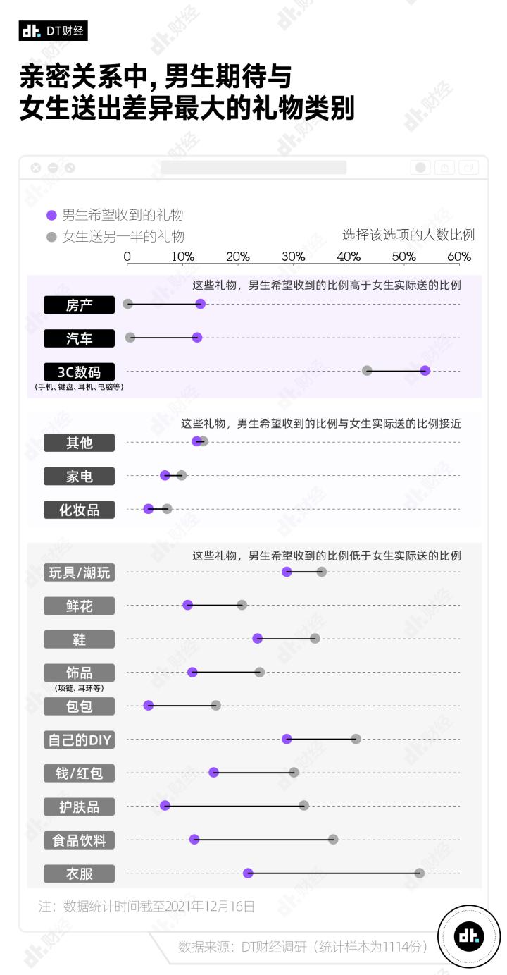 总地来说,如果要给亲密关系中的男方送礼3C数码是大家可以继续重点发挥的领域,玩具潮玩、自己的DIY、鞋和衣服也可以在长期的送礼旅程中作为储备池。