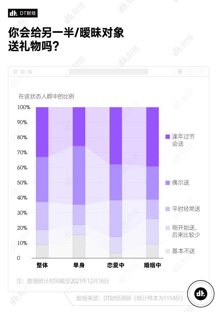 亲密关系中的男男女女们,在已经确认关系,但还没获得红皮书稳定保护(限制)的阶段为另一半送礼最为积极。本次调研中,处于恋爱中的男女送礼比例和频率都更高。他们在“平时经常送”这一最高频选项上表现突出,选中比例达到1/4,这个数字差不多是单身和已婚人群的2倍。