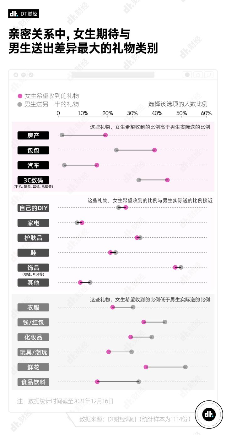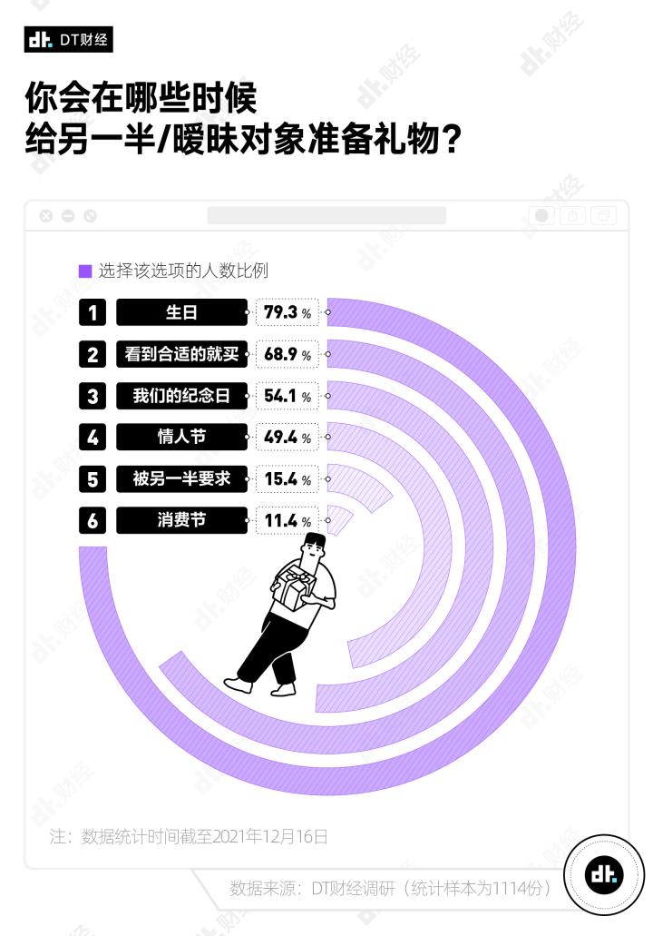 另一个有些打破刻板印象的结果是,情人节并不是爱情中礼品交换最为旺盛的节点。即便DT也不可免俗地在情人节推送这份送礼报告,但回到现实生活,生日才是亲密关系中的送礼必要时刻,8成受访者会在生日给另一半或暧昧对象准备礼物。