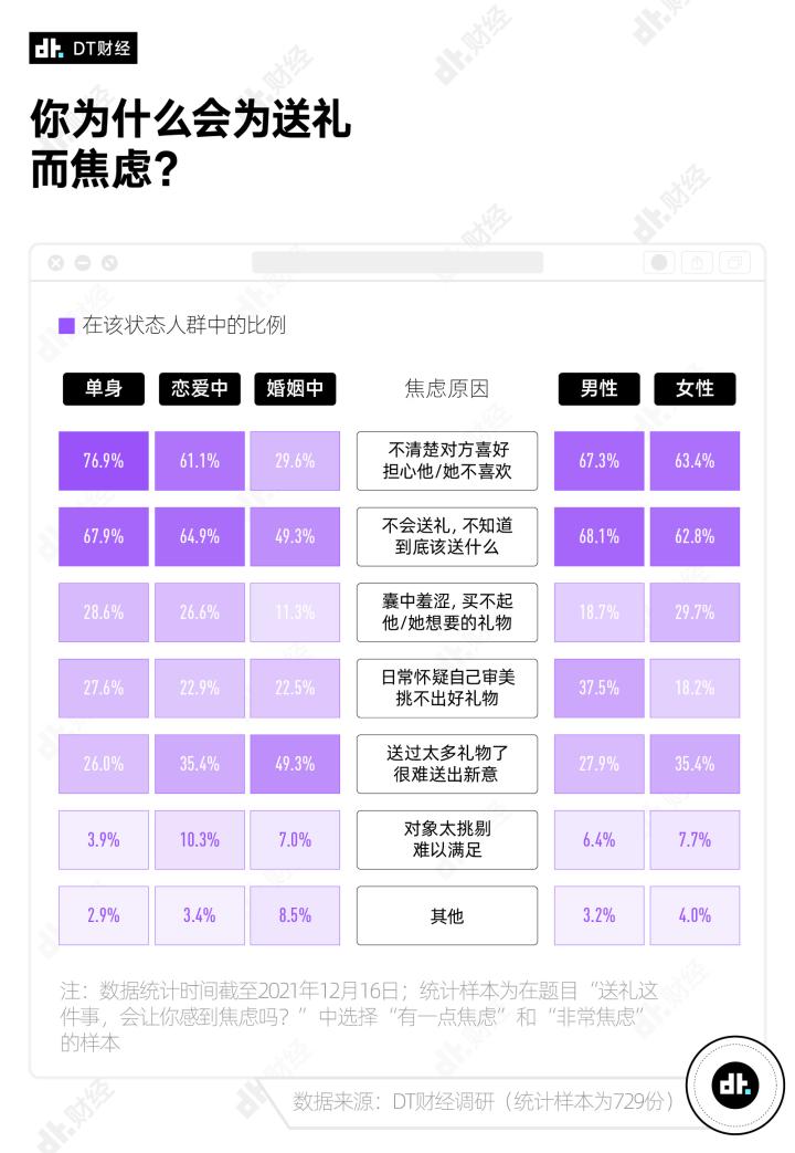 除了上述两个共性送礼焦虑,不同人群在一些次要焦虑点上有不同的偏向。关系越稳定,就越容易因为礼物无法送出新意感到焦虑。