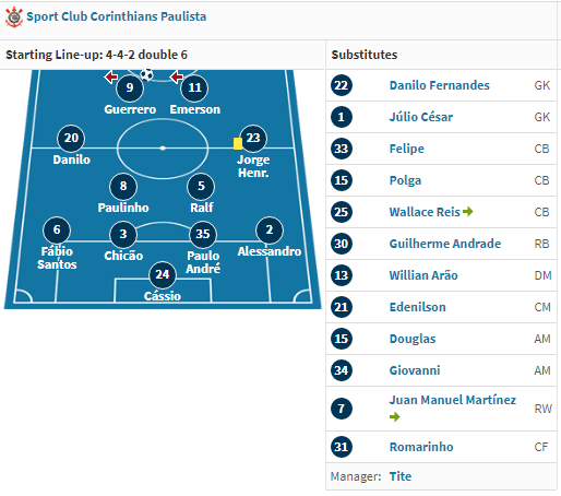科林蒂安的首发阵容也有大家的老熟人,双后腰保利尼奥、拉尔夫后续都登上了中超的赛场,现马竞中卫费利佩当时也在板凳席待命,而在后续加盟申花的中卫保罗-安德烈同样首发登场,前锋格雷罗则是打进了全场比赛唯一进球的球员。
