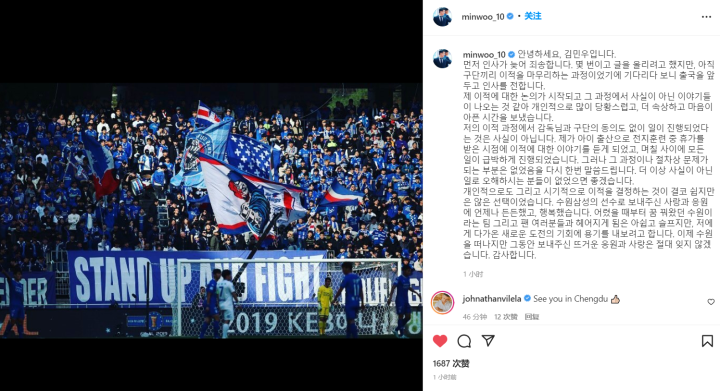 不过据金敃友本人称,他的转会绝对是符合流程规范的:“随着关于我转会的讨论越来越多,一些不真实的消息被广泛传播,这些消息使得我经历了一段尴尬、不安和心碎的时间。我的转会过程是经过了主教练和俱乐部的同意了的。因为孩子的出生,我是在陪产的过程中才得知了关于我工作调动的消息,但我想重申的是,这整个程序是没有任何问题的。作为一名球员,水原三星给予我的爱和支持总是让我感到安心和快乐。与从小就梦想的球队说再见令人遗憾,但我将勇敢地迎接新的挑战。我就要离开水原了,但我永远不会忘记你们给我的温暖的支持和爱。谢谢你们!”作为曾经和未来的队友,乔纳森也放下了手中的钓鱼竿,第一时间在金敃友的这条动态下评论道:“我们成都再见。”