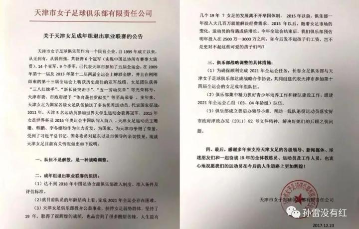 大连女足解散前两年,天津汇森女足宣布成年组退出职业联赛。在官方公告中有这么几句话:“女足的发展离不开举国体制,2015年以前,俱乐部一年投入大几百万就能解决经费需求,2015年以后,随着女足市场的变化,运动员的待遇成倍增长。今年全运会结束后,我们俱乐部预估明年投入在2500-3000万之间,如今后发不起孩子们工资,岂不是更对不起这些可爱的孩子们吗?”