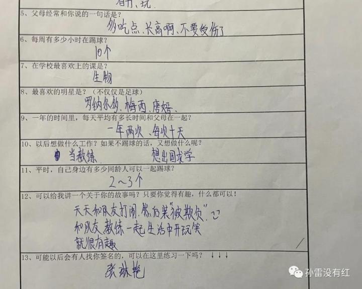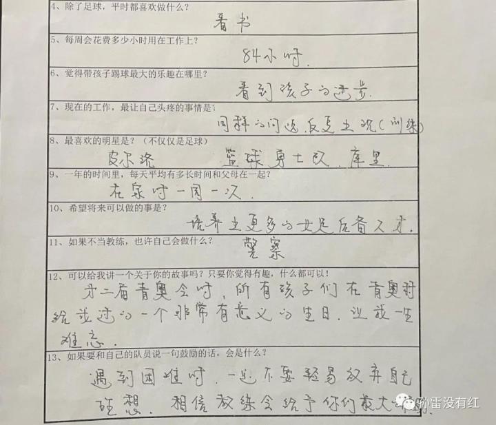 这张调查表来自于当时中国U-14女足的主教练郑茂梅。问题10里,我问道:“希望将来可以做的事是?”