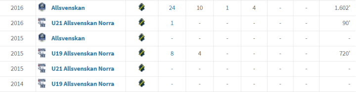 16岁开始出场瑞典U19联赛,是当仁不让的主力中锋,代表球队出场8次打进4球。17岁开始又被越级直接提拔上一线队出场24次10球1助攻,这样出色的表现难免引起众多欧洲豪门的注意。