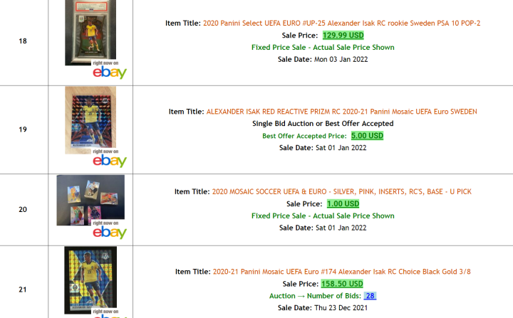 伊萨克普卡价格较低,非新秀年的普通折射价格不超过30元,但是RC带编价格高昂。PSA10评级25编普卡成交价已经来到了800多元人民币,欧洲杯马赛克RC带8编折射已经近千元,目前他的卡仍是市场上的大热门。