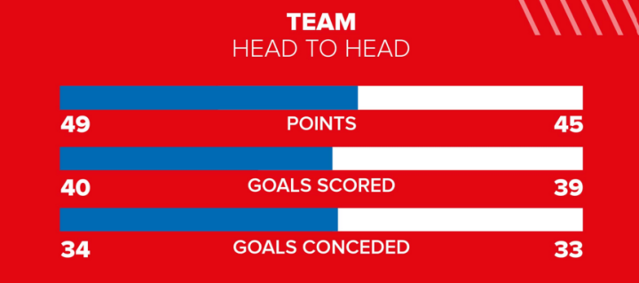 目前两队在联赛中的进球数和丢球数都基本相同。
