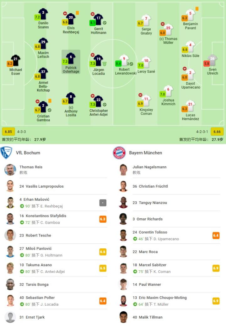 拜仁慕尼黑首发:26-乌尔赖希、5-帕瓦尔、4-聚勒、2-于帕梅卡诺(46' 24-托利索)、21-卢卡斯-埃尔南德斯、6-基米希、7-格纳布里、25-托马斯-穆勒(64' 13-舒波-莫廷)、10-萨内、11-金斯利-科曼(75' 18-萨比策)、9-莱万多夫斯基;