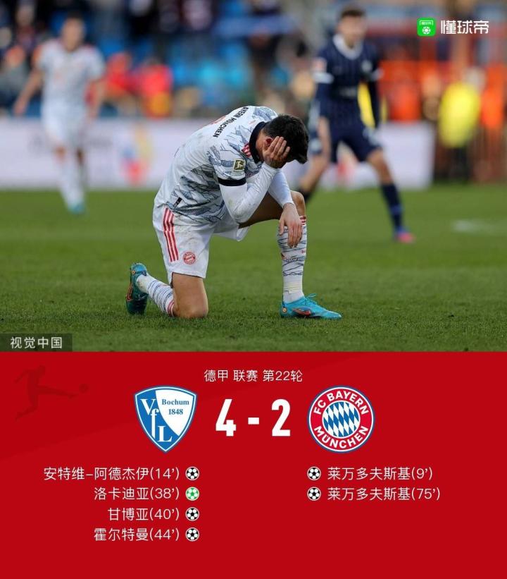 北京时间2月12日22:30,德甲联赛第22轮的一场较量,拜仁慕尼黑奔赴客场,挑战波鸿。上半场,金斯利-科曼助攻莱万多夫斯基破门,霍尔特曼助攻安特维-阿德杰伊扳平,随后雷克斯贝卡伊造点,洛卡迪亚主罚命中,甘博亚世界波破门,霍尔特曼扩大比分,波鸿暂时4-1拜仁慕尼黑;下半场,奥斯特哈格、安特维-阿德杰伊进球被吹,莱万多夫斯基扳回一球+任意球中楣。最终,拜仁慕尼黑客场2-4不敌波鸿。