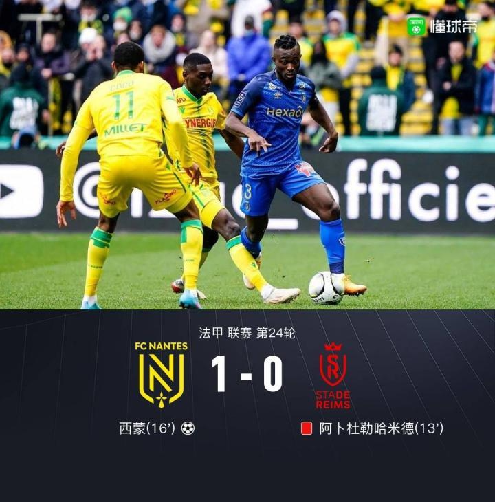南特1-0十人兰斯,西蒙任意球一剑封喉,阿卜杜勒哈米德染红