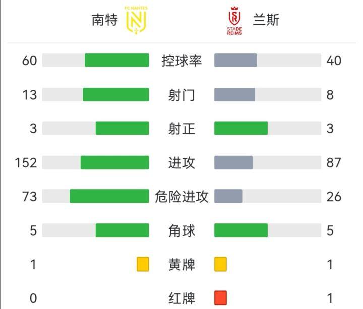 北京时间2月13日22:00,法甲第24轮继续进行,南特坐镇主场迎战兰斯。上半场,阿卜杜勒哈米德开场13分钟便被直红罚下,紧接着西蒙任意球直接破门。下半场,双方均无建树。最终,南特主场1-0击败十人兰斯。
