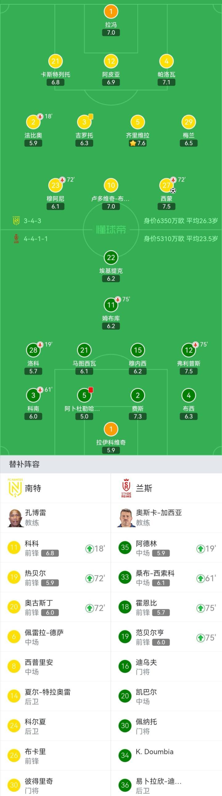 南特首发:1-拉冯、2-法比奥(18'11-科科)、12-阿皮亚、3-吉罗托、4-帕洛瓦、29-梅兰、21-卡斯特列托、5-齐里维拉、27-西蒙(72'20-奥古斯丁)、23-穆阿尼(73'19-热贝尔)、10-卢多维奇-布拉斯