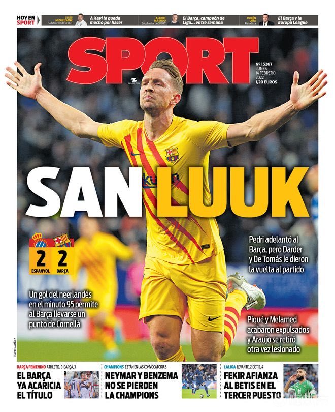圣·卢克佩德里昨晚为巴萨闪电破门,卢克·德容补时...每日体育报 @懂球帝2022-02-14 12:05圣·卢克 佩德里昨晚为巴萨闪电破门,卢克·德容补时阶段读秒扳平,让巴萨以2-2的比分从客场带走一分。 1,巴萨女足客场3-0战胜毕尔巴鄂竞技,距离提前夺冠仅有一步之遥。 2,本周欧冠赛场,皇马将与巴黎圣日尔曼激烈交锋。 3,莱万特2-4皇家贝蒂斯,费基尔梅开二度。 每体封面展开更多
