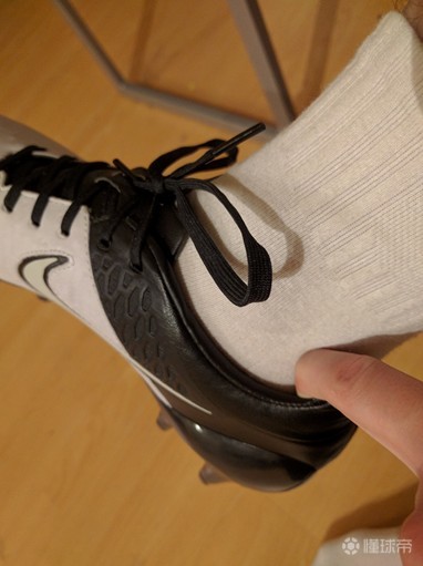 对于球鞋前掌两侧部分的包裹性,从上面这张图中可以很明显的看出:完美!两侧的袋鼠皮几乎摁不下去,有些人可能不喜欢这样的设计,但是不得不说这柔软的袋鼠皮还有舒适的内衬完全解决了这个问题,贴合度十分高。就算真的脚太宽了觉得挤脚,就像前文说的,撑几场绝对没问题。