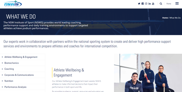 “维基百科:新南威尔士体育学院(NSWIS)是一家位于澳大利亚新南威尔士州的高水平运动训练机构。新南威尔士州政府向运动员提供世界领先的教练、比赛支持和日常训练设施。我们能够做到同时保障运动员福利、职业训练和学历教育。我们帮助精英和年轻运动员,发挥他们的最大潜能”