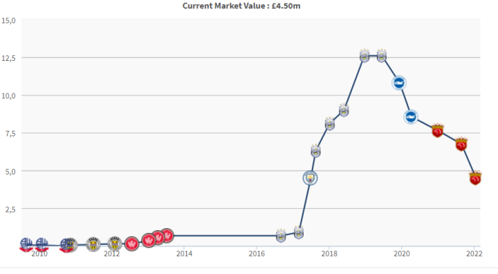 穆伊已经到了职业生涯的末年,身价趋势免不了大幅下跌,由职业生涯巅峰的1250万欧元下跌到不足500万欧元。但穆伊依然具备效力英超的能力,英超最后一年(效力于布莱顿)的穆伊依然是球队绝对主力,目前效力上海海港,完全具备帮助球队夺冠的能力。不知道有没有海港球迷能告诉我海港的球星卡盒子有没有穆伊签字?
