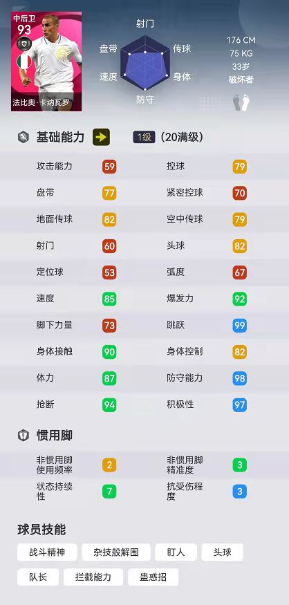 在这次时刻版本的卡纳瓦罗设定上,99的跳跃,99的防守能力以及99的积极性,绝对符合卡纳瓦罗防守球员“天花板”的气质;另外94的爆发力、93的身体接触以及98的抢断,也说明卡纳瓦罗并不是一个“善茬”,不仅防守力度大,也是非常凶悍的。