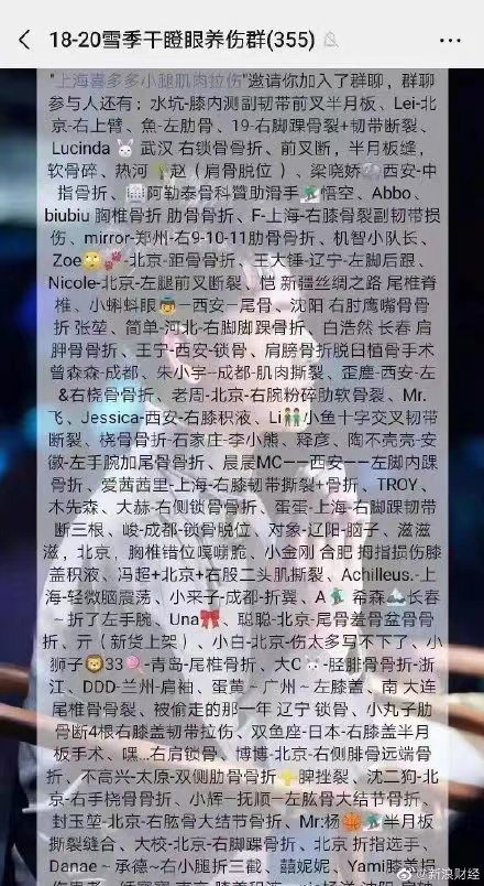 这样看下来,雪地运动不仅价格高,受伤的可能性也比较大。网上流传的一张“雪地干瞪眼养伤群”的截图,也说明了这个问题——滑雪可能让你遭遇半月板撕裂、手骨骨折、肌肉撕裂等几乎所有种类的运动伤病。