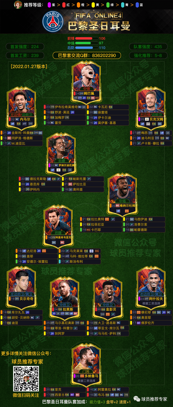设定紫色12分,红色10分,橙色8分,黄色7分,绿色5分,青色3分,蓝色1分(首发的得分需乘以2)。队套得分为36人大名单的球员的得分(36名球员分别是:首发11人得分+除首发11人外的11个位置前两名+另外3名队内得分最高的球员)。根据规则得出巴黎套的首发得分是:224,队套得分是:431。
