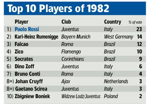 在最终得票的前十球员中,意大利球员占据四席,而意大利才华横溢的对手巴西队中,法尔考、济科和苏格拉底最终排分别为3、4、5。毫无疑问的是,全世界的足球迷都曾被世界杯上璀璨华丽的巴西队所吸引,所以即便在1982年巴西队并没有获得世界杯冠军,他们依然被投票成了《世界足球》年度最佳球队。