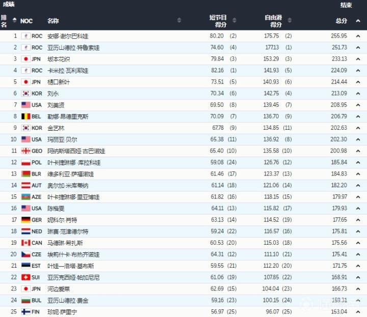 花样滑冰女单自由滑最后一组,俄罗斯奥委会选手安娜-谢尔巴科娃以完美无瑕的表演和出众的感染力得到全场第二高的自由滑分数175.75分,再加上80.20的短节目得分,总得分255.95分,获得了最终的冠军。