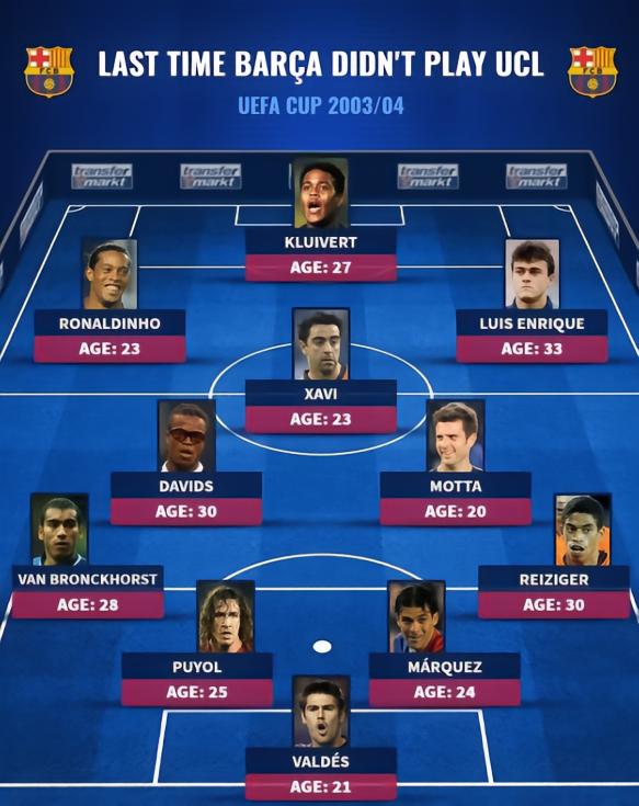 在今天凌晨结束的欧联杯淘汰赛附加赛比赛中,巴塞罗那主场1-1踢平那不勒斯。本赛季巴塞罗那欧冠小组赛没能出线,最终排名小组第三,参加欧联杯的比赛。而巴塞罗那上一次踢欧联还是18年前的03-04赛季,当时的欧联杯还叫作联盟杯。德国知名足球数据网站“转会市场”列出了当时巴塞罗那的阵容,克鲁伊维特和小罗领衔攻击线。