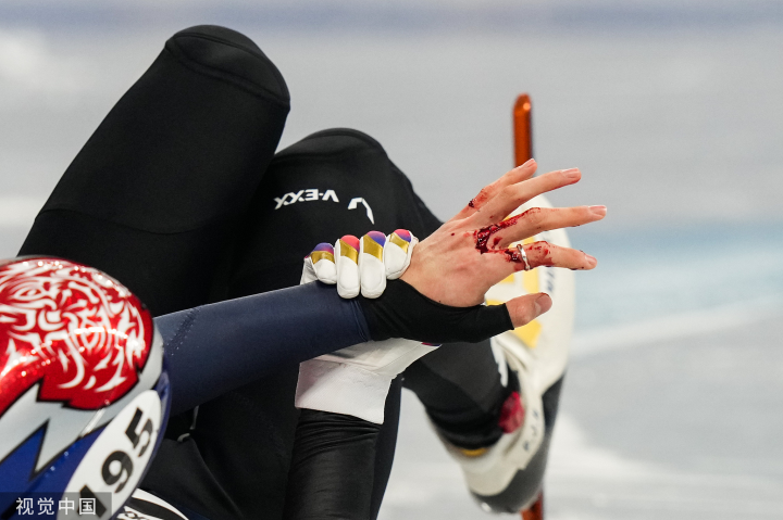 北京冬奥会短道速滑男子1000米1/4决赛上,韩国选手朴章赫与加拿大选手及意大利选手卷入了争夺之中,他的左手被冰刀划伤,顿时鲜血直流。