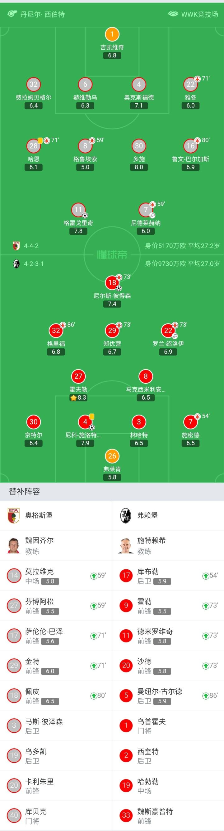 奥格斯堡首发:1-吉凯维奇、22-雅各、4-奥克斯福德、6-赫维勒乌、32-费拉姆贝格尔、30-多施、28-哈恩、8-格鲁埃索、30-多施、16-巴尔加斯、7-尼德莱赫纳、11-格雷戈里奇