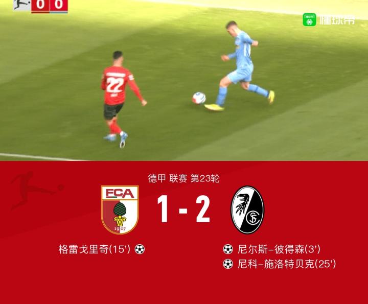 弗赖堡客场2-1奥格斯堡,彼得森闪击,格雷戈里奇破门难救主