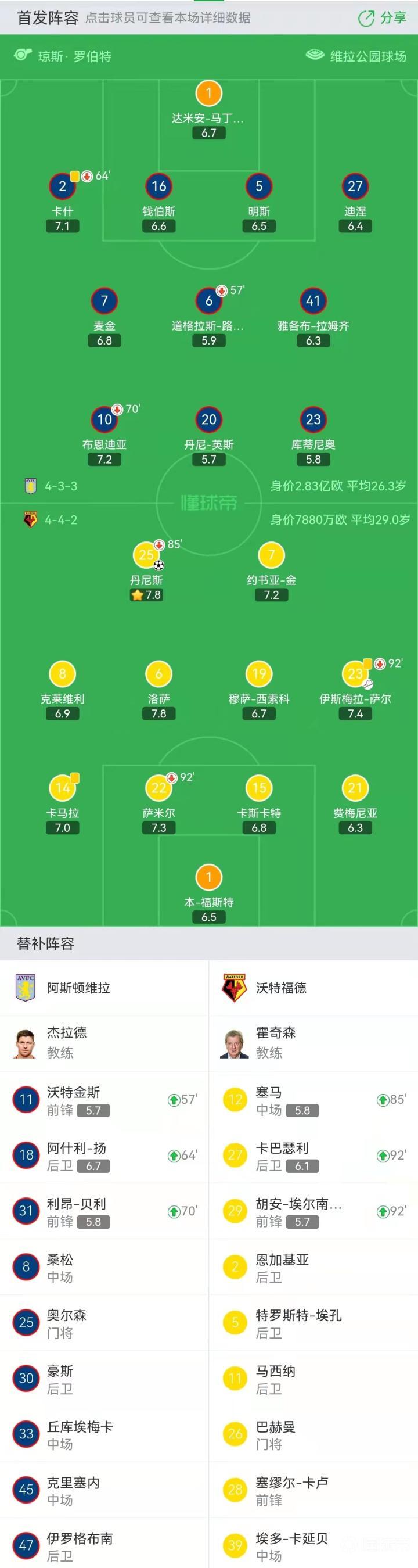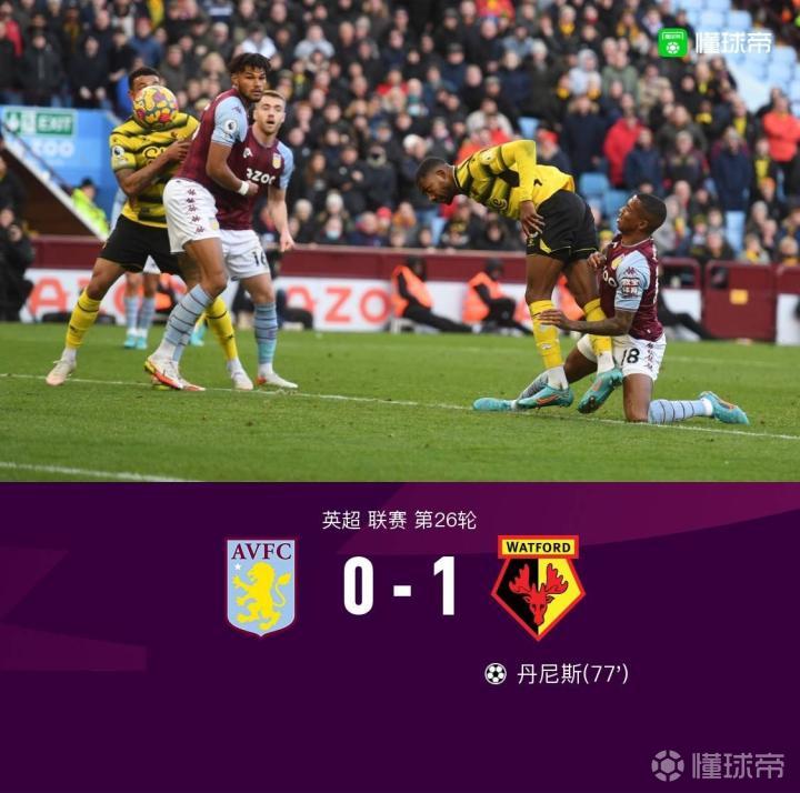 阿斯顿维拉0-1沃特福德,丹尼斯制胜球,大马丁屡献扑救