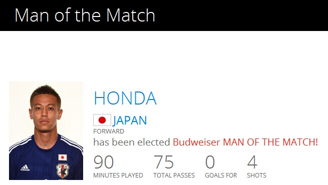 国际足联当场最佳:本田圭佑雷杰深2014-06-20 08:04 北京时间6月20日,世界杯小组赛,日本0-0战平希腊。赛后,日本队本田圭佑被评为当场最佳球员。 数据方面,本田打满全场,75脚传球,4次射门。但他的表现没能为日本带来三分。展开更多