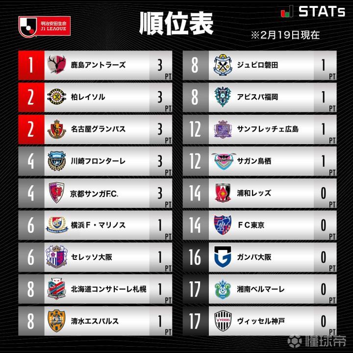 最终,鹿岛鹿角客场3-1击败大阪钢巴,暂时登上积分榜首位。