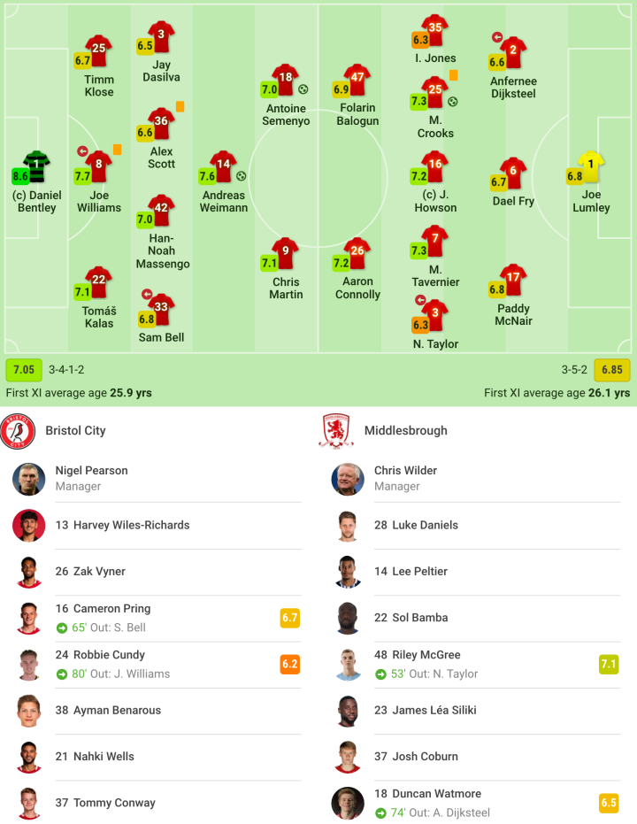 布里斯托尔城首发阵容:Bentley, Dasilva, Kalas, Klose, Bell (Pring 65'), Scott, Massengo, Williams (Cundy 80'), Weimann, Martin, Semenyo.