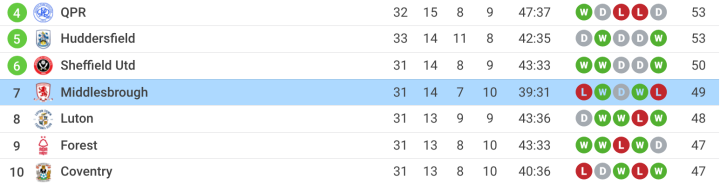 本轮比赛结束后,米德尔斯堡积49分跌出积分榜前六位