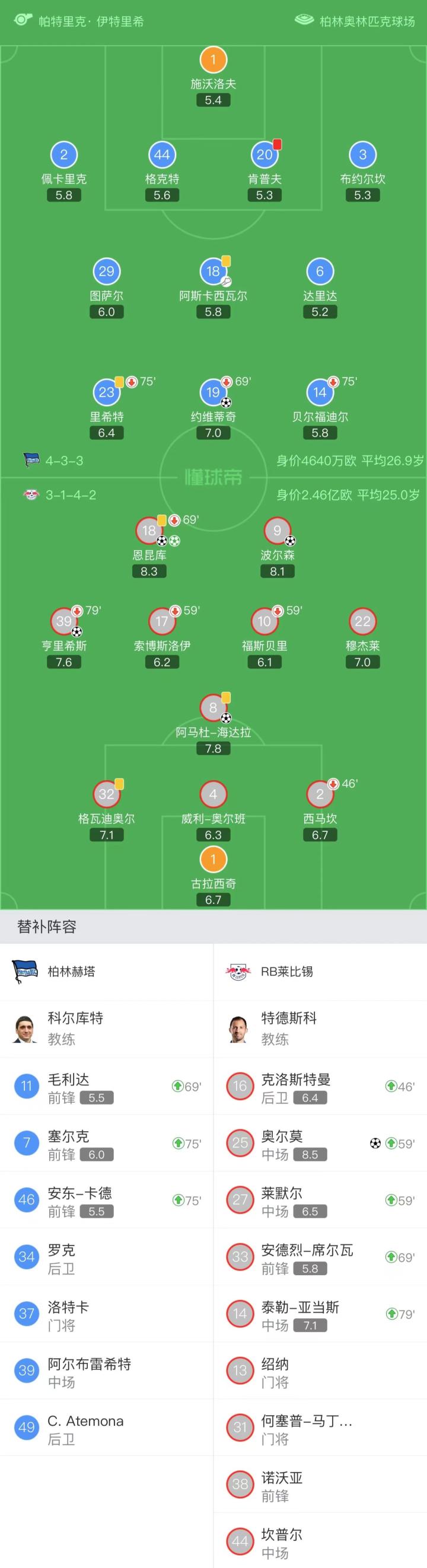 莱比锡首发:1-古拉西奇、2-西马坎(46'克洛斯特曼)、4-威利-奥尔班、8-阿马杜-海达拉、9-波尔森、10-福斯贝里(60'27-莱默尔)、17-索博斯洛伊(60'25-奥尔莫)、18-恩昆库(70'33-安德烈-席尔瓦)、22-穆杰莱、32-格瓦迪奥尔、39-亨里希斯(80'14-泰勒-亚当斯)