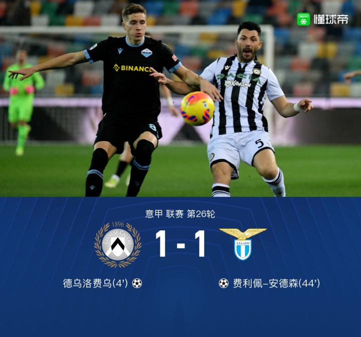 北京时间2月21日3:45,意甲第26轮,乌迪内斯主场对阵拉齐奥。上半场,德乌洛费乌破门,费利佩-安德森头球扳平。下半场,卡布拉尔推射打偏,玛肯戈远射被斯特拉科沙扑出,莫利纳抽射中框,最终,乌迪内斯1-1拉齐奥。