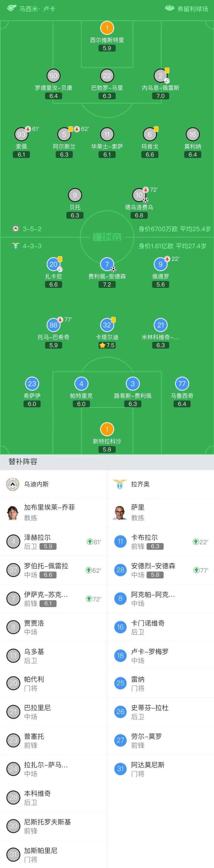 拉齐奥首发:1-斯特拉科沙、23-希萨伊、3-路易斯-费利佩、4-帕特里克、77-马鲁西奇、21-米林科维奇-萨维奇、32-卡塔尔迪、88-托马-巴希奇、7-费利佩-安德森、9-佩德罗(23'11-卡布拉尔)、20-扎卡尼