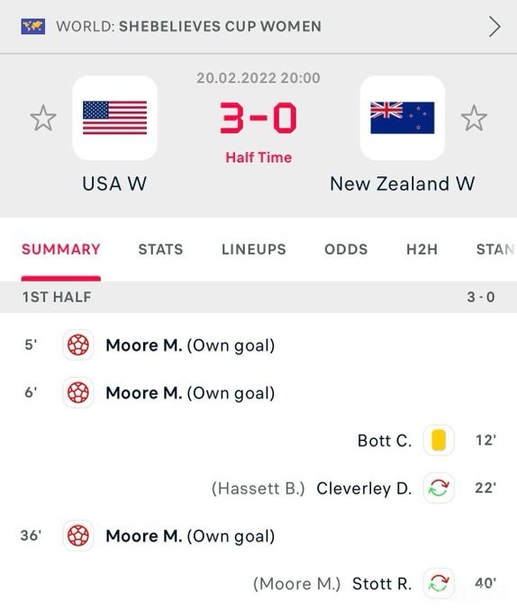 今日凌晨,新西兰女足在“Shebelieves Cup”中迎战美国女足,代表新西兰女足出场的后卫球员梅凯拉-摩尔从刚刚开场便接连出现失误,“头顶脚踢”连续三次将对方的传中球打进自家大门,完成“乌龙帽子戏法”。